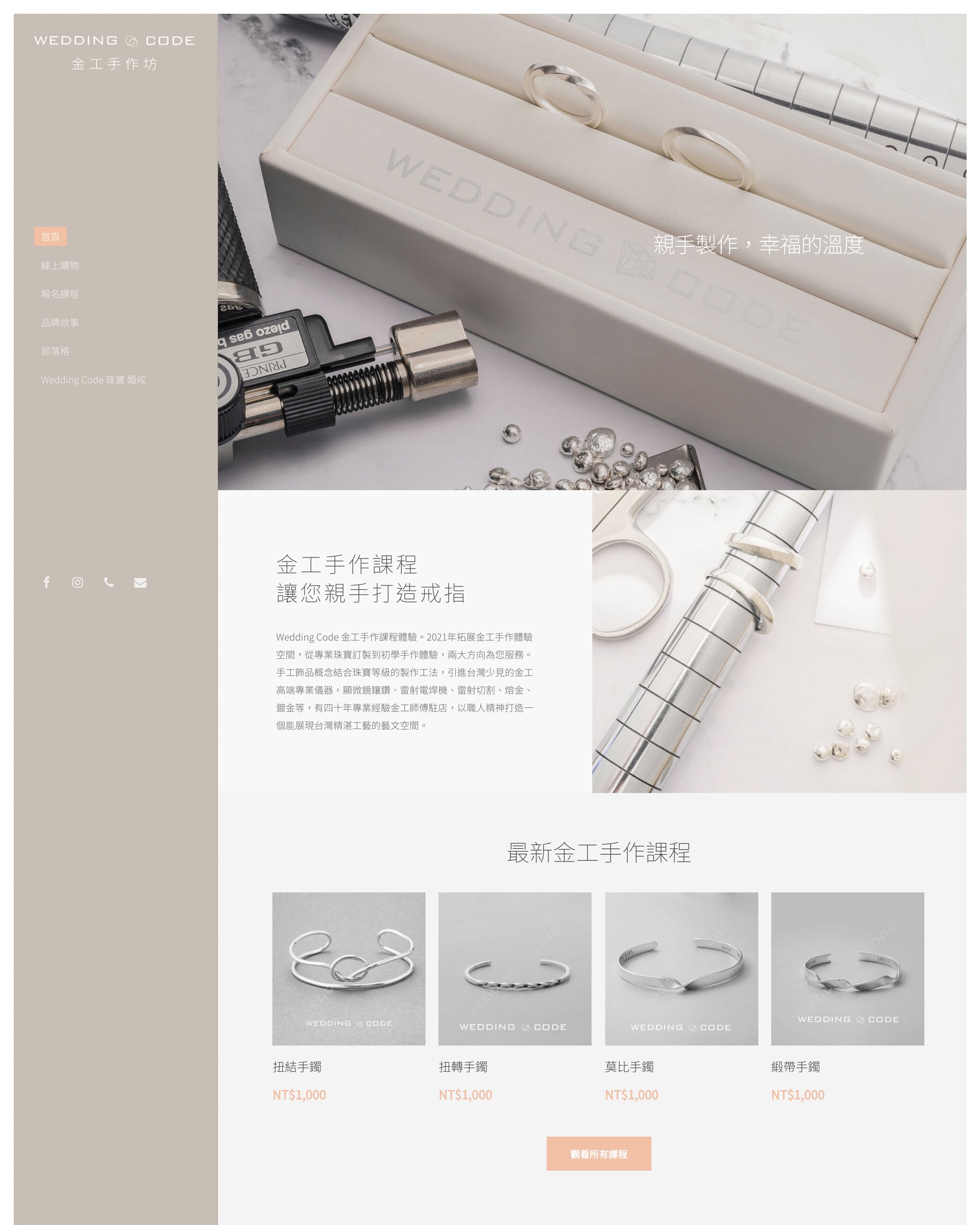 回到 Wedding Code 金工手作坊這個網站本身,它的定位很清楚,就是透過網站介面讓人可以報名課程,節省人力客服成本。對於金工手作課程的人,可以在網站上可以選擇想要製作的大致款式,了解其中可以客製化的項目,接著預付課程訂金,選擇日期之後,就完成了報名手續。同時,在網站也同步販售銀製商品,供客人參考。由於銀製商品的單價較為親民,可以幫助 Wedding Code 服務這個預算的客群(例如學生),並與原本主站的客群做出區隔。