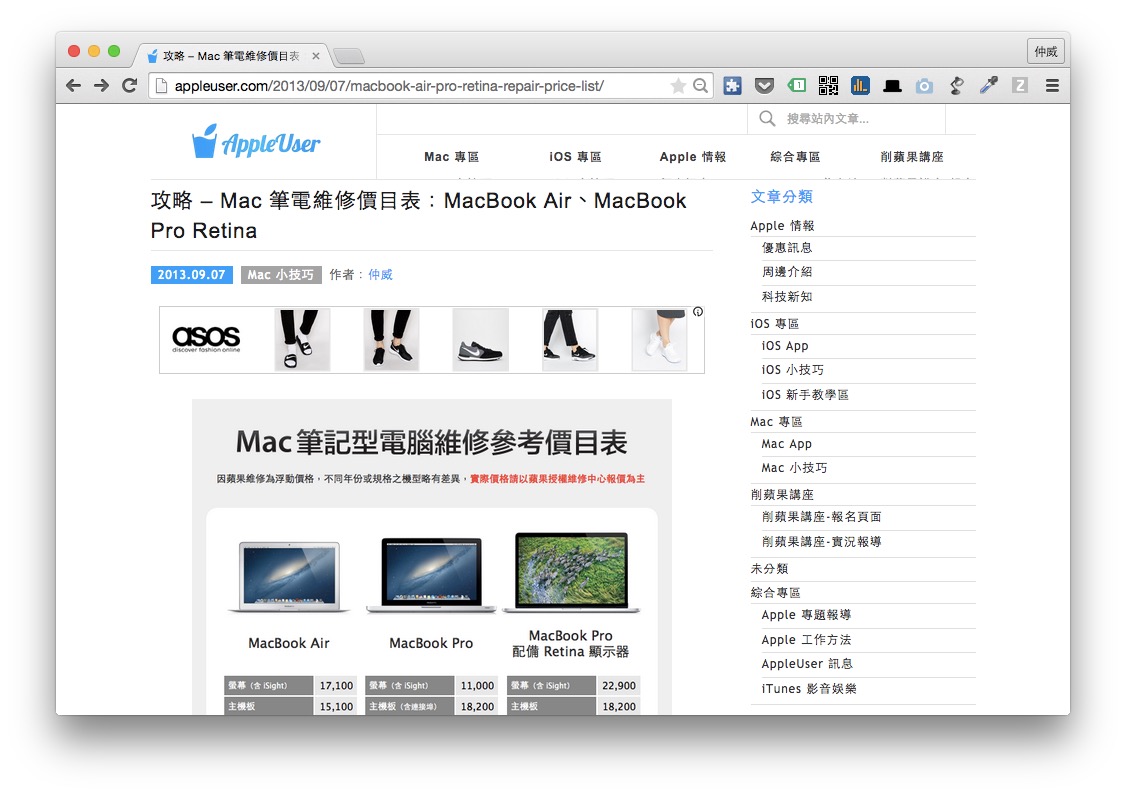 於是,AppleUser 決定製作一份方便 user 查詢對照的 Mac 維修價格表,希望它夠時常被搜尋到。成品如下,圖表直接標示當時主流的維修機種。