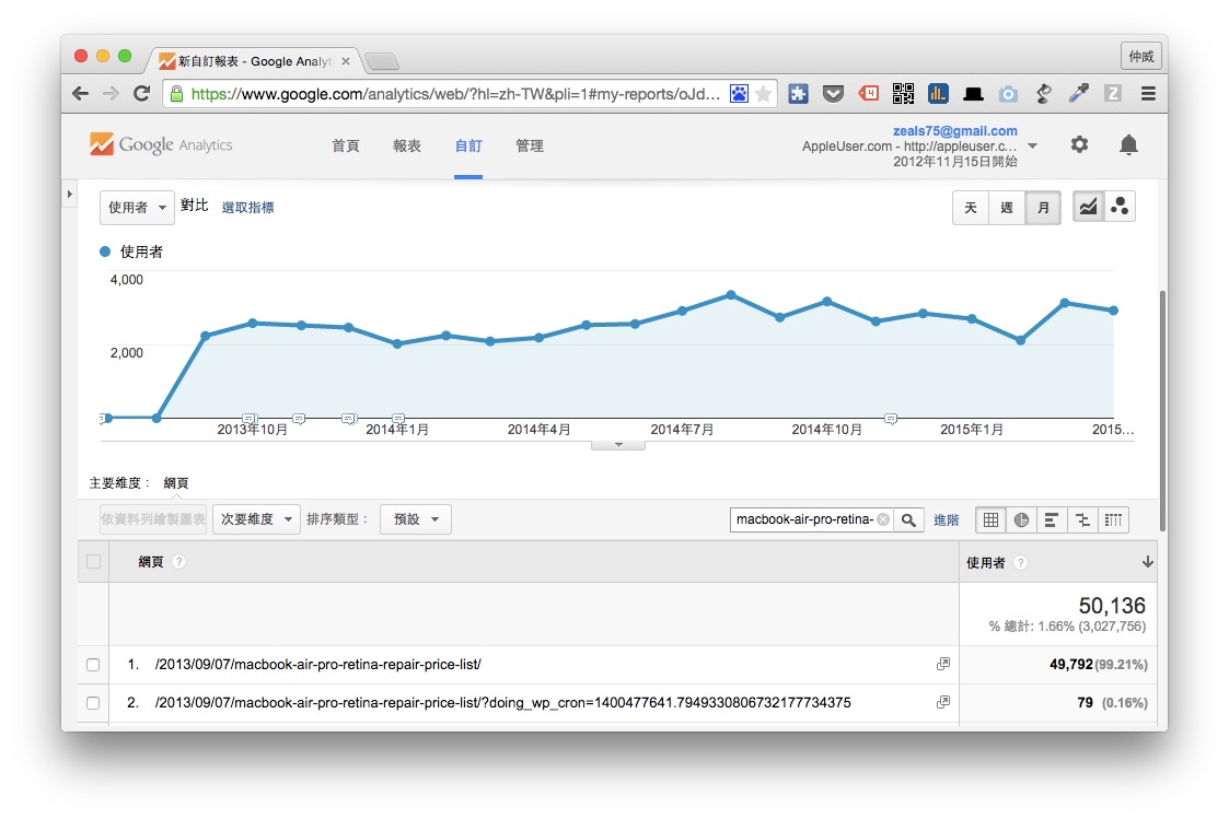 AppleUser《Mac 筆電維修價目表》文章推出近兩年來,每個月都固定吸引兩、三千名讀者進入 AppleUser 觀看,至今已累計約 5 萬人看過這篇文章,並蟬聯「mac 維修 價格」相關關鍵字的搜尋結果第一名。從下表 Google Analytics 流量分析可看出,文章的流量自發表日開始,就呈現穩定的「一字型」,而非一般 Campaign 的「潮起潮落型」。